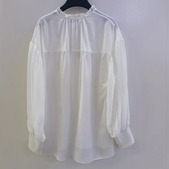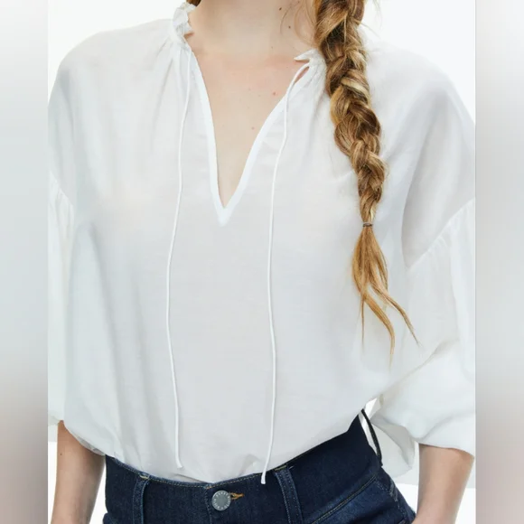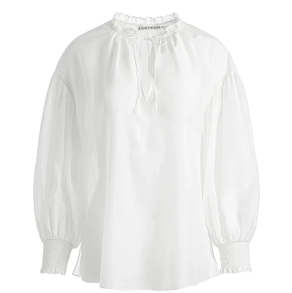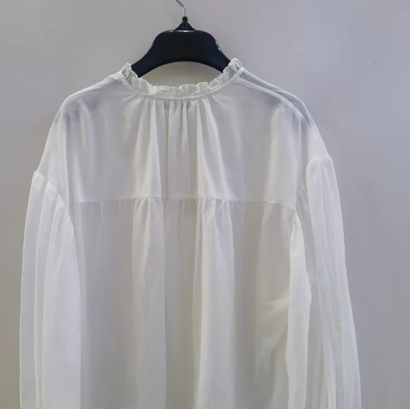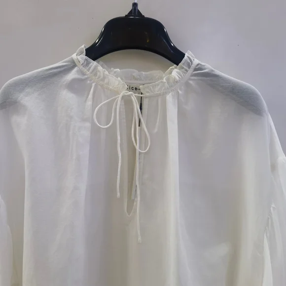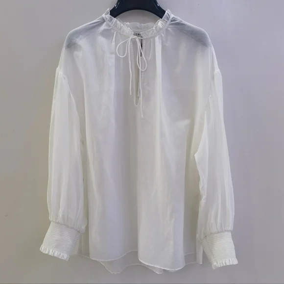 size XS, S, M, LNWT, All Offers are welcomeVoluminous tops are one of the most effortless ways to get dressed and this one, with the luxe cotton and silk fabric, is our new favorite. We love the oversized fit and a detail that seems to balance the volume: The fitted shirt cuffs.Long blouson sleevesTie neck70% cotton, 30% silkDry clean onlyImportedModel is wearing a size Small and her measurements are 5’10”, 32” bust, 23” waist, 34” hipTotal length: 26 3/4"Fits true to size, take your normal size❤️🎤 Items are sold as-is. All merchandise is 100% authentic, sourced directly from exclusive fashion trunk shows, industry conventions, sample sales, and overstock events. Due to the unique nature of our inventory, sizes and quantities are limited, ensuring you receive one-of-a-kind pieces at exceptional value. Shop with confidence knowing every item is genuine and carefully curated.❤️ Some items may be without tags or have labels/care labels marked or partially removed. These minor adjustments are a result of special sales initiatives or policies to prevent store returns, ensuring you receive authentic products at incredible value. Each piece is carefully curated, offering you a unique opportunity to own premium items at a fraction of the cost.
